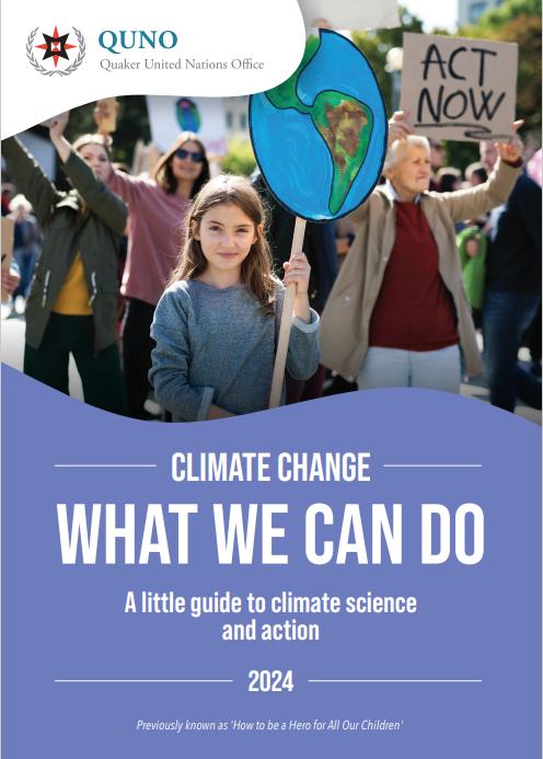 The Quaker United Nations Office (QUNO) in Geneva published a ‘Climate Change: What We Can Do” (previously known as ‘How to be a Hero for All Our Children’) which is available in English, Arabic, Spanish. and French. It aims to connect people with the most recent climate science and suggests personal actions and questions for politicians.