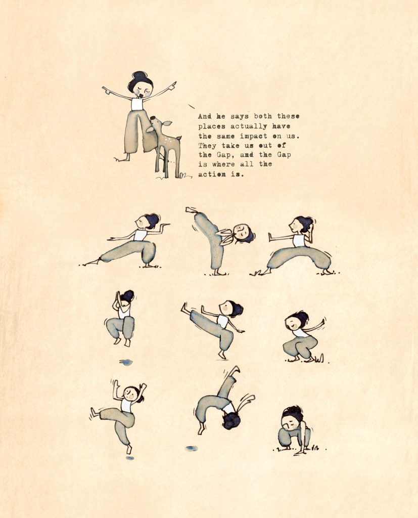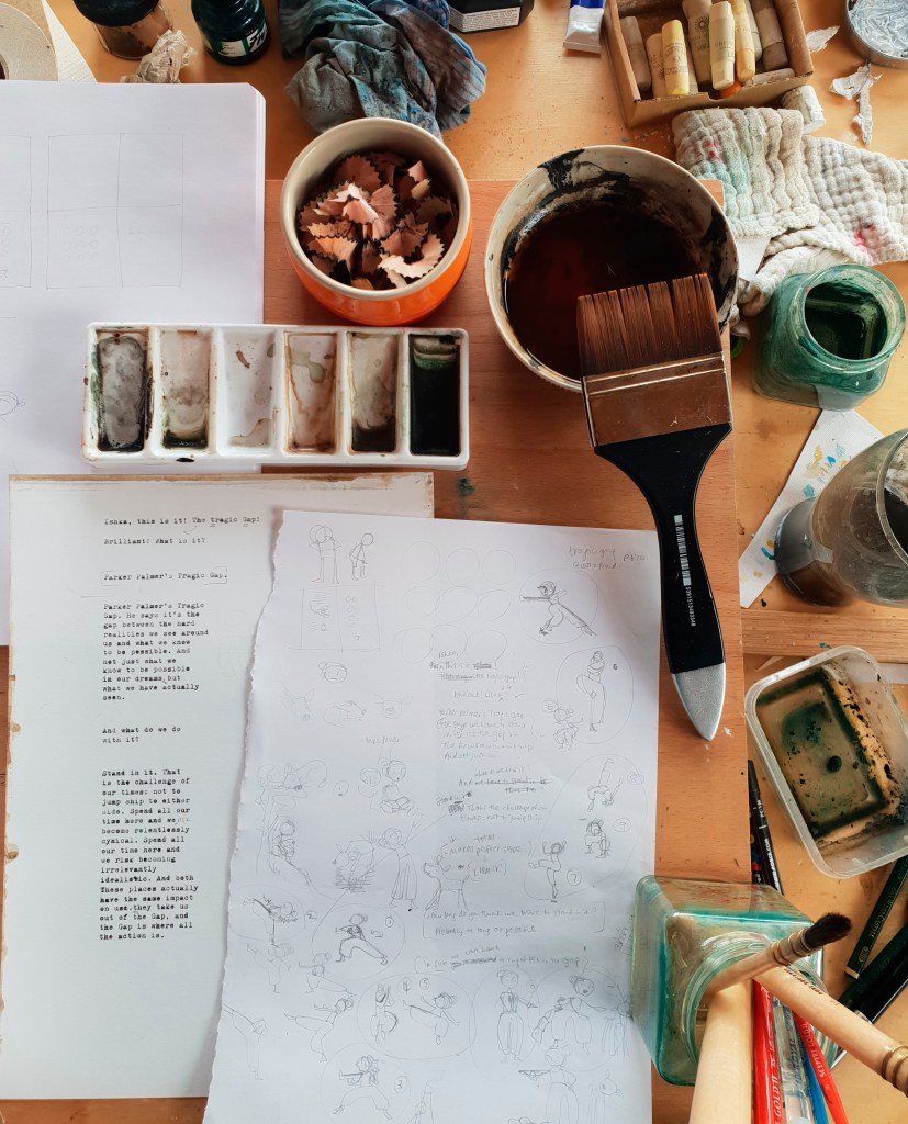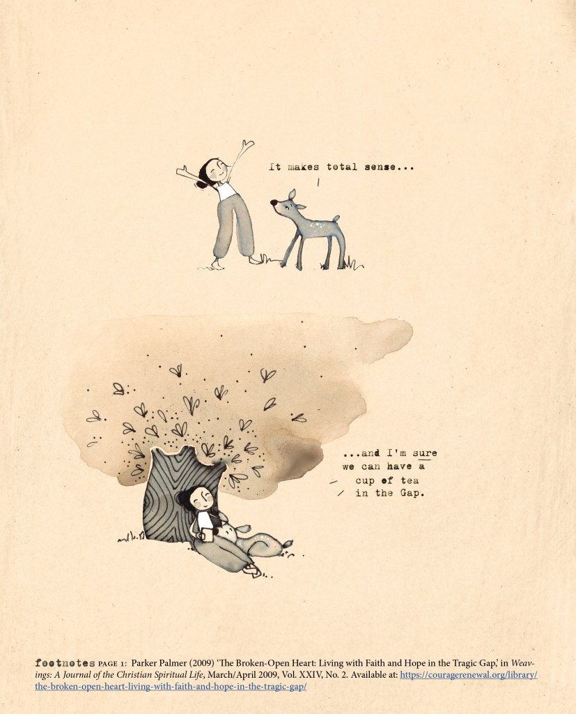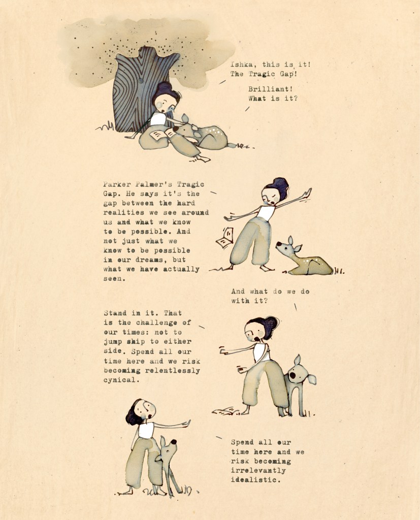 Lynn Finnegan, a Quaker based on the north coast of Ireland, is doing a year-long art and storytelling project called Fig & Ishka. It involves illustrated stories about two friends who paddleboard, grow food, read, hike, and sit around the fire together. They are also trying to show up to the world’s current ecological and social crises without jumping ship to complacency, cynicism or despair. Fig & Ishka often draws upon wisdom found in the teachings of Quakerism, systems thinker and activist Joanna Macy, and Buddhist Zen master Thich Nhat Hanh.