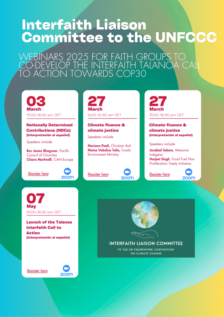 The Interfaith Liaison Committee, is organizing a webinar series in spring 2025 and invites all interested individuals and interfaith organizations to attend and co-develop the Interfaith Talanoa Call to Action towards COP30.